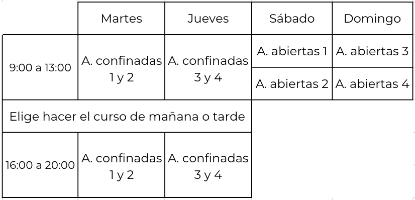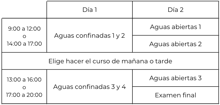Este curso de buceo está diseñado para quienes buscan una formación completa y progresiva, combinando práctica en distintos entornos. La primera parte del curso se realiza durante 2 días de aguas confinadas entre semana, donde aprenderás y practicarás las habilidades básicas de buceo en un entorno controlado y seguro.